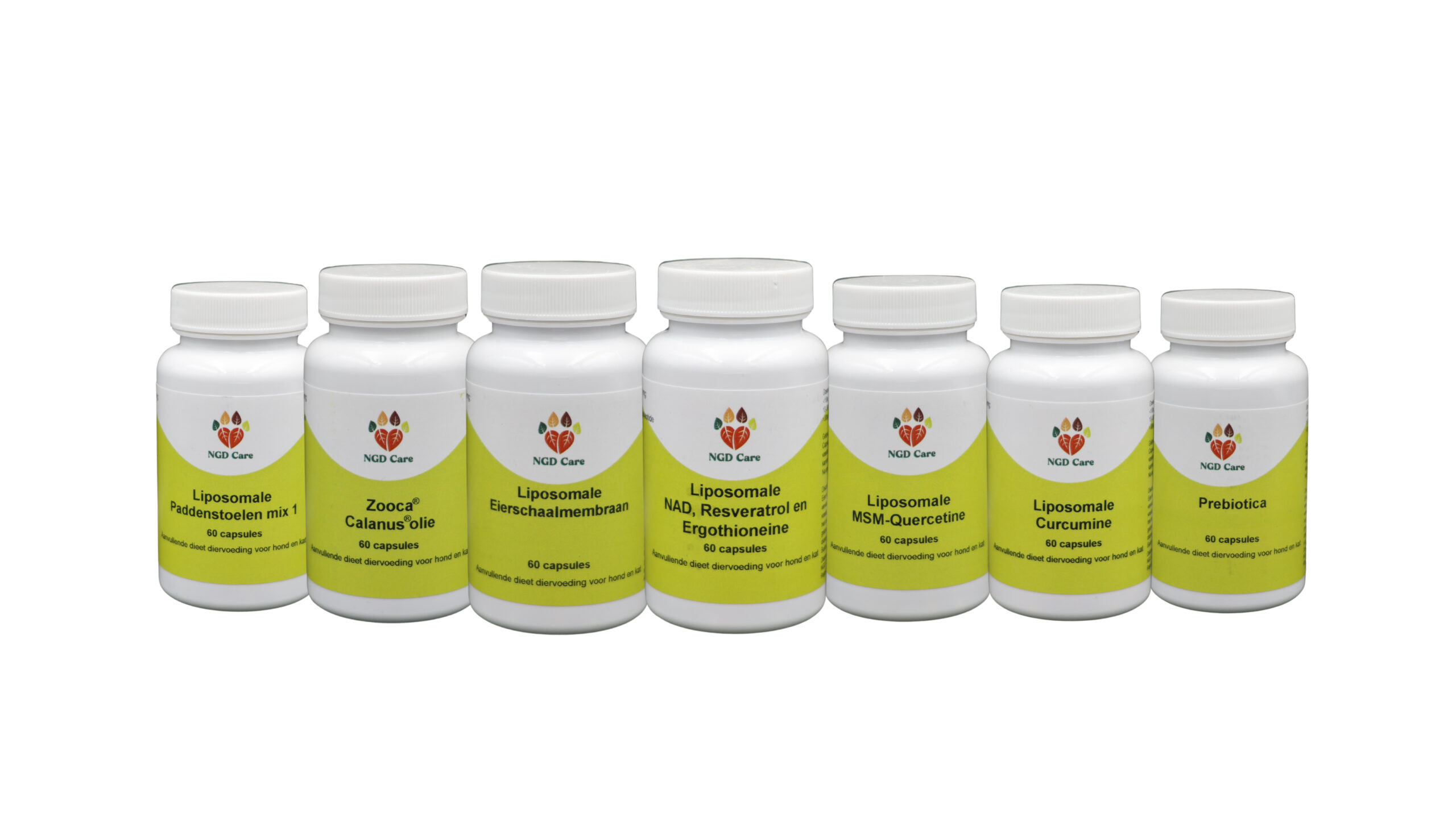 Aldringsprotokollen er spesielt utviklet for å støtte aldringsprosesser hos hunder og katter på en naturlig måte. Høy alder er assosiert med synkende kollagenproduksjon, redusert variasjon i mikrobiomet, oksidativt stress, kronisk betennelse og nedgang i DNA-reparasjonskapasitet. Denne protokollen kombinerer syv kraftige kosttilskudd som hemmer disse prosessene og støtter kroppen når det gjelder vitalitet, immunitet og bevegelsesfrihet.